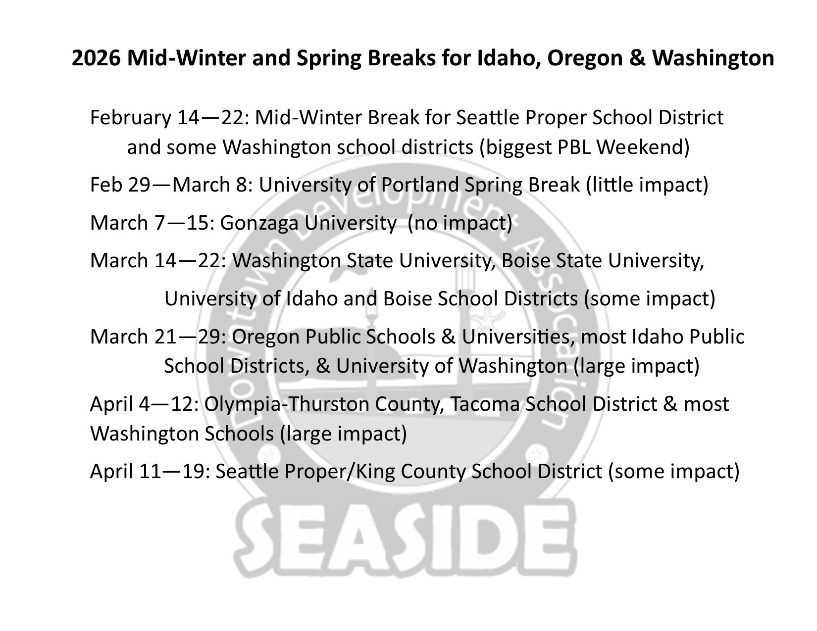 Pacific Basketball League (PBL), Conventions, holidays and school vacations have a great impact in Seaside. Make sure that you are aware of the following dates and schedules. All are subject to change.